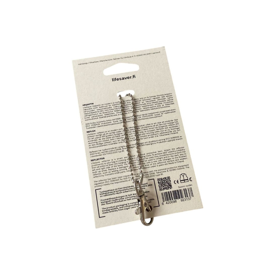 - Sisältö CE-hyväksytty heijastinkalvo (EN 17353:2020 jalankulkijaheijastin sertifioitu ja EN ISO 20471:2013 sertifioitu), CE-hyväksytty ftalaattivapaa muovi, kiinnikemateriaali kromattua metallia, tuotepakkaus kierrätettävää, biohajoavaa ja kompostoituvaa ekokartonkia.
