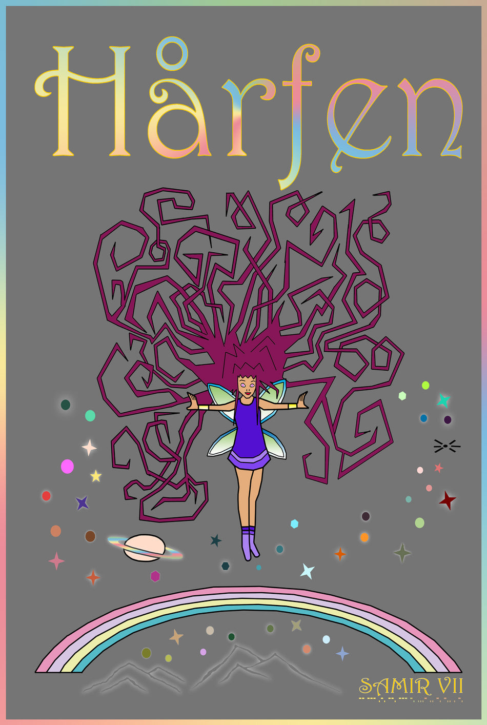 Nu är det dags att lära känna Hårfen. Du kanske har hört talas om tandfen, jultomten och påskharen, men vet du vem hårfen är? Det visste inte Anna-Maria innan hennes farfar läste ur den gamla sagoboken om hårfen Raya som sprider regnbågsglitter över barnen när de sover. Anna-Maria är tio år och farfar är på besök. När han ska åka tillbaka till Egypten där han bor ger han Anna-Maria en gåva – ett par magiska glasögon. Anna-Maria tycker att hon börjar bli för gammal för att tro på sagor, feer och magiska saker, men farfar bara skrattar och säger att hon ska vänta och se vad som händer. En natt, då Anna-Maria tar på sig de hundraåriga glasögonen, ser hon hur en liten fe flyger runt i hennes rum. Det är hårfen Raya som är på besök och hon behöver Anna-Marias hjälp och det är bråttom. I den magiska världen härjar Krusbärstrollet. Han suddar bort de magiska varelserna från sagorna så att deras trovärdighet försvinner. Snart är det ingen som tror på hårfen, tandfen, påskharen eller ens jultomten längre. Anna-Maria följer med Raya genom den magiska portalen för att stoppa Krusbärstrollet. Men för att lyckas krävs samarbete, laganda och tålamod – något som inte alltid är så lätt. Har hårfen Raya och henens magiska vänner det som krävs och kan Anna-Maria hjälpa dem innan det är för sent? I Hårfen får du lära känna Raya och de andra magiska varelserna i Himmelsbron.