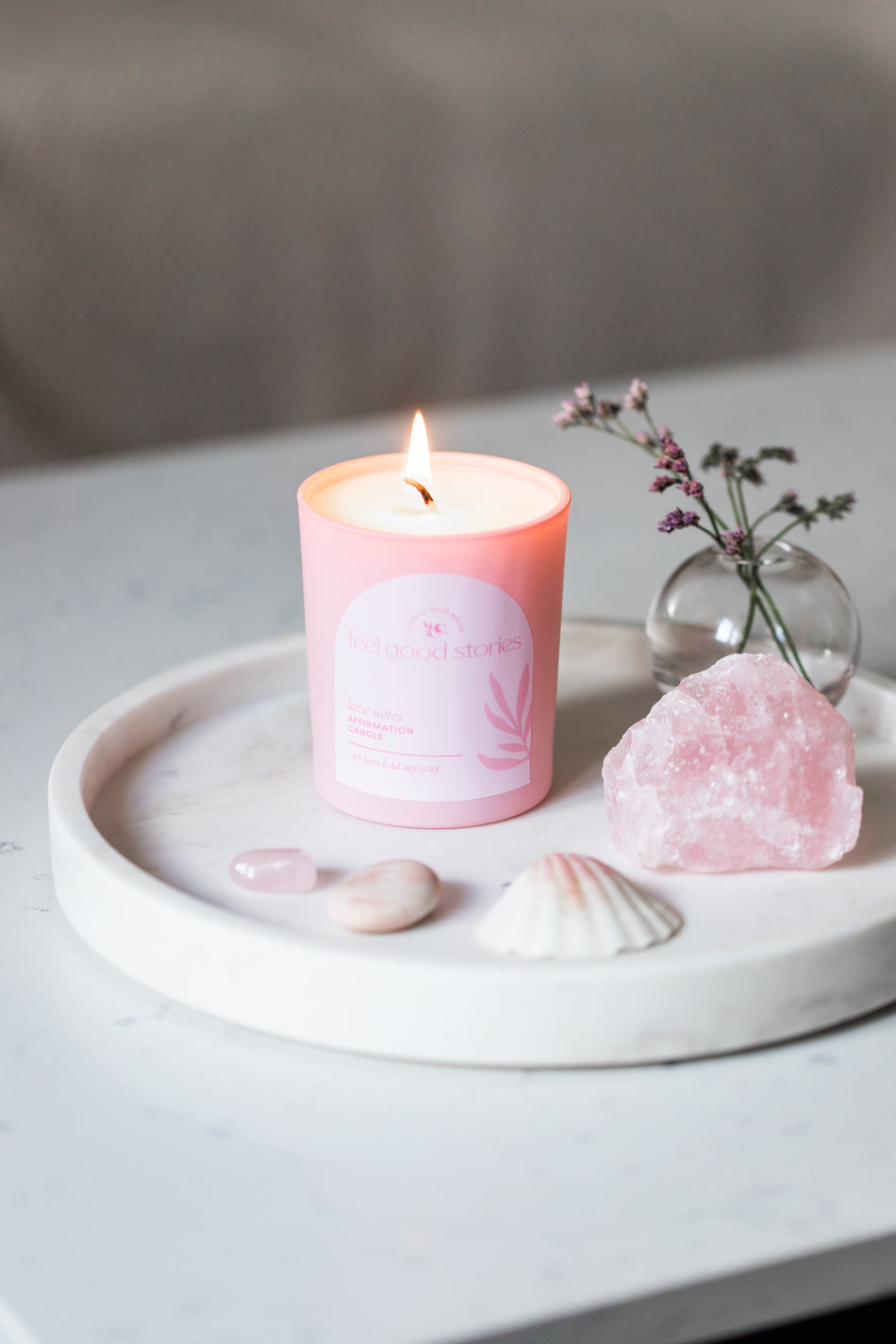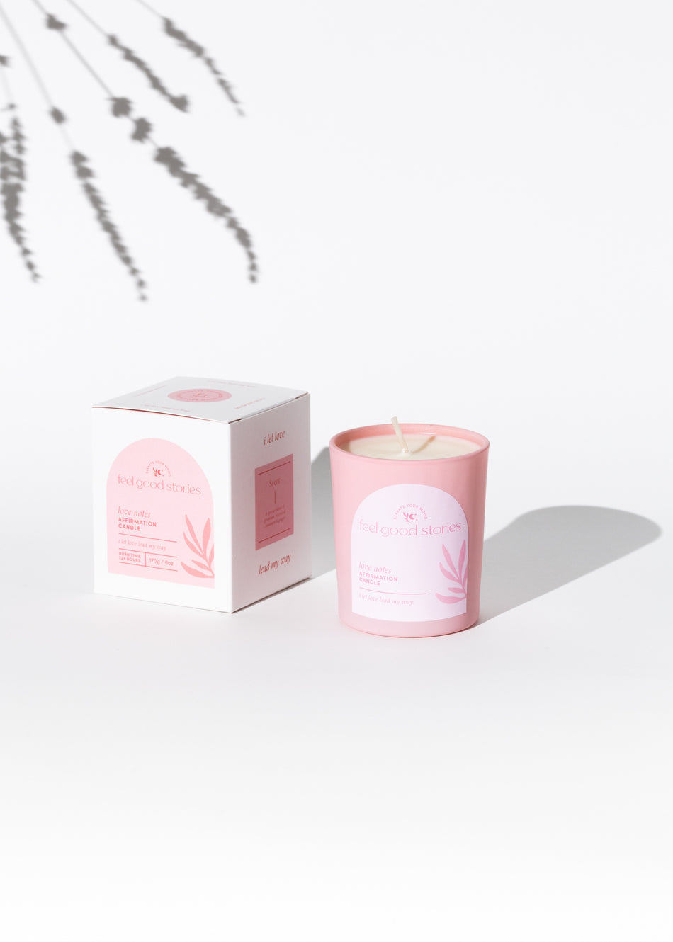Kynttilässä on hyvinvointia vahvistava affirmaatiolause: I let love lead my way (Annan rakkauden ohjata minua kaikessa mitä teen).