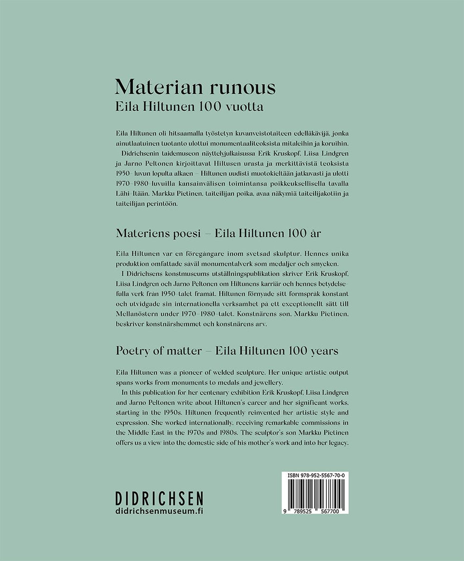 Kuvanveistäjä Eila Hiltusen (1922-2003) syntymästä tulee kuluneeksi 100 vuotta 22.11.2022. Materian runous - Eila Hiltunen 100 vuotta -näyttely on esillä Didrichsenin taidemuseossa 10.9.2022-29.1.2023. Näyttelyjulkaisu esittelee sukupolvensa kansainvälisimpiin taiteilijoihin lukeutuneen Hiltusen ... Lue lisää