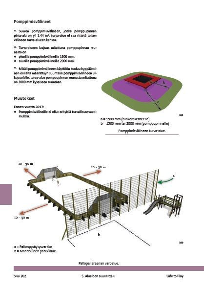 • Avainsanat vuositarkastus; Ulkoleikkialue; kiipeilyvälineet; keinut; boulderingvälineet; aluesuunnittelu; Ylläpito; Välinekapasiteetti; Vaatteen kiinnijuuttuminen; Ulkokuntolaite; köysiradat; Tarkastus; Tarkastajien pätevyys; Taloyhtiön leikkialue; TR 16879; TR 16467; TR 16396; käyttöönottotarkastus; leikkikenttävälineet; Sisäleikkipaikka; riskinarviointi; vapaa tila; turvallisuussuunnittelu; turvallisuusasiakirja; turvallisuus; turva-alue; tietokirjat; skeittialueet; rapex; leikkikentät; putoamistila; parkour; palloilualueet; obstaakkeli; liikunta-alueet; leikkipuistot; leikkipaikat; Suljetut leikkivälineet; Rullalautailualueet; Iskunvaimennus; EN 15312; Ikäluokitus; Huolto; Esteettömät leikkikenttävälineet; EN 16899; EN 16630; EN 16579; EN 14974; Julkiseen käyttöön asetetut kuntolaitteet; EN 12572; EN 1177; EN 1176; Asennus; Antropometria; Päiväkodin leikkialue; Karusellit; Aktiviteettipuisto; Liukumäet; Putoamisalue; Pelikenttävarusteet; Peliareena; Parkourvälineet; Pallopelimaali; Pakottava liike; Liikuntavälineet; Kaulan kiinnijuuttuminen; Kriittisen putoamiskorkeuden määritysmenetelmä; Koulun leikkialue; Koripalloteline; Kolmiulotteiset kiipeilyverkot; Kiipeilyrakenteet; Keinumisvälineet; Aluekapasiteetti
