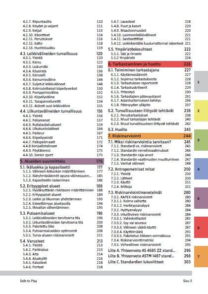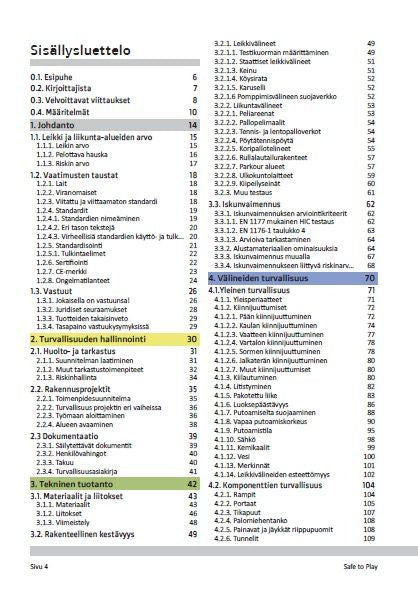 Kaikki leikki-ja liikunta-alueiden turvallisuudesta koottuna yksiin kansiin. Sisältää käytännön tiedon 20:stä alan standardista ja teknisestä raportista; myös standardien vaatimusten viiteluettelon.