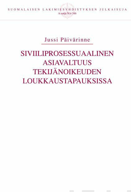 Asiavaltuuskysymysten käsittely, jäsentäminen ja ratkaiseminen on huomattavasti laajempi ja monitahoisempi kokonaisuus kuin ensi näkemältä saattaa vaikuttaa. Teoksen tarkoituksena on avata tätä kompleksista kokonaisuutta sekä antaa kattava kokonaiskuva niistä prosessuaalisista ja aineellisoikeudellisista erityiskysymyksistä, jotka liittyvät siviilioikeudellisissa tekijänoikeuden loukkaustapauksissa aktualisoituviin asiavaltuuskysymyksiin ja muihin asiavaltuuteen läheisesti kytköksissä oleviin kysymyksiin.