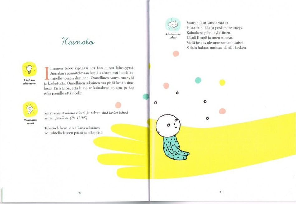 Iloinen materiaali vauvaryhmien käyttöön sisältää 11 upouutta laulua, kutittelua, sylittelyä ja toimintaa. Teemat nousevat vauvan arjesta ja yhdistyvät raamatunteksteihin. Käsittelyssä ovat värit, armo, tuuli, vauhti, maito, vesi, kainalo, kikatus.