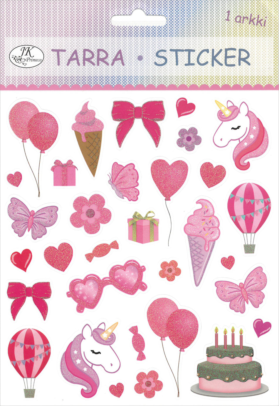 Tarra-arkki askarteluun ja koristeluun. Pakkaus sisältää yhden arkin erilaisia paperisia tarroja glitterillä. Arkin koko on n. 15cm x 17cm.