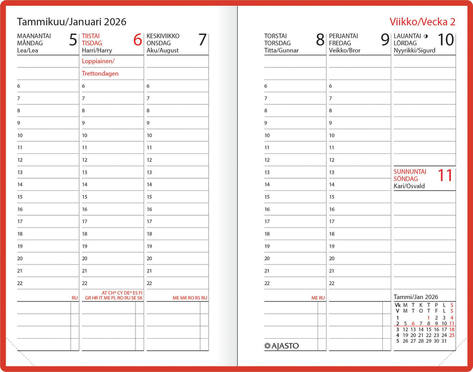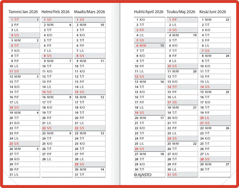 Koko 82 x 128 mm; leatherette-kannet; sidottu; kielisyys: suomi, ruotsi; aukeamalla pystyviikko; päiväkirja 47/2025 - 4/2027; vuosisuunnitelmat 2026 ja 2027; suomalaiset ja suomenruotsalaiset nimipäivät; kansalliset vapaapäivät; liputuspäivät Suomessa; muistiinpanosivuja; vuosiruudukko; takana es... Lue lisää