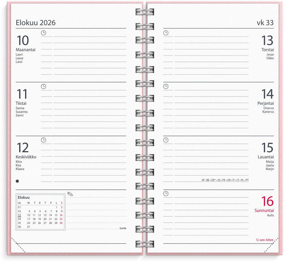Painettu keinonahkakansi. Pellavatekstiilikansi. Kalenterin aukeamalla yksi viikko ja kuluvan kuukauden kalenteritaulukko. Kalenteri sisältää nimipäivät, kansalliset pyhäpäivät, liputuspäivät, kuun vaiheet, vuosisuunnitelmat kuluvalle ja seuraavalle vuodelle, yleiset pyhäpäivät Euroopassa, kalend... Lue lisää