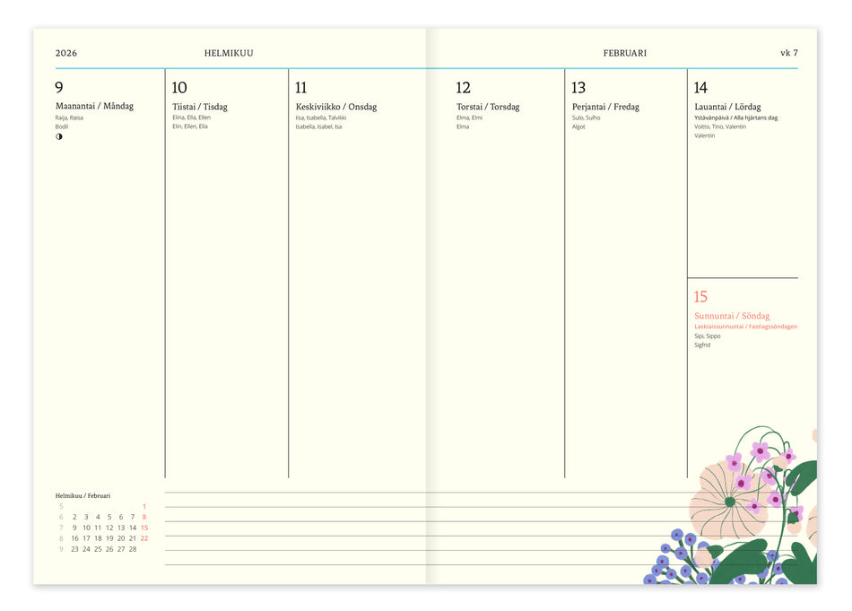 Polka Paperin pieni kovakantinen 2026 viikkopäivyri ihastuttavilla kuvituksilla. Aukeamalla viikkonäkymä ja tilaa muistiinpanoille. Kuukausinäkymät joka kuulle sekä sisäkuvitúksia. Kalenteri on kaksikielinen ja sisältää suomalaiset ja suomenruotsalaiset liputuspäivät, sekä kuun vaiheet. Lue lisää