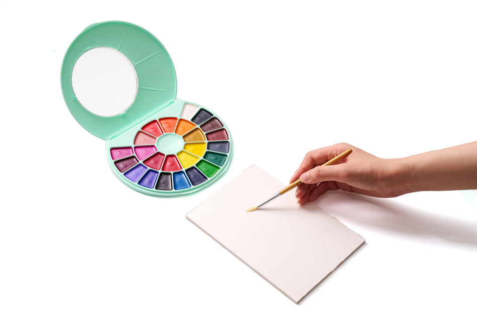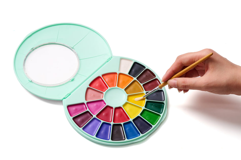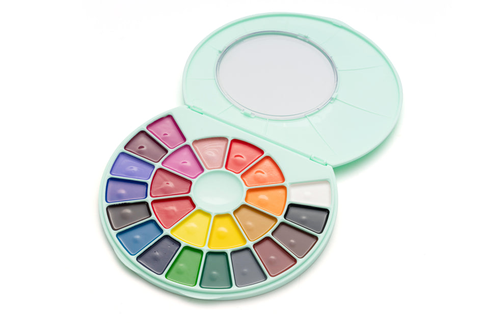 24 kirkasta, sekoitettavissa olevaa vesiväriä hauskassa vihreässä kotelossa. Ilmainen sivellin sisältyy pakkaukseen, täydellinen aloittelijoille ja luoville harrastajille. Lue lisää