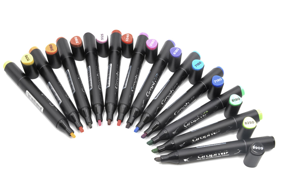 Graph'it tussikynät 12 kpl pakkaus. Kaksipuolisissa kynissä terävä ja taltta kärki. Kynien kärjet valmistettu Japanissa. Lajitelmassa 12 kirkasta väriä. Lue lisää