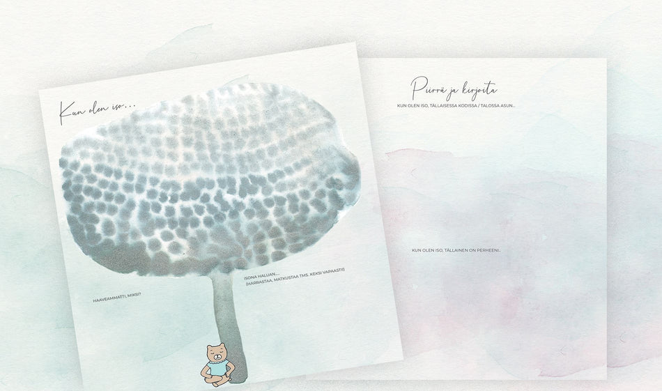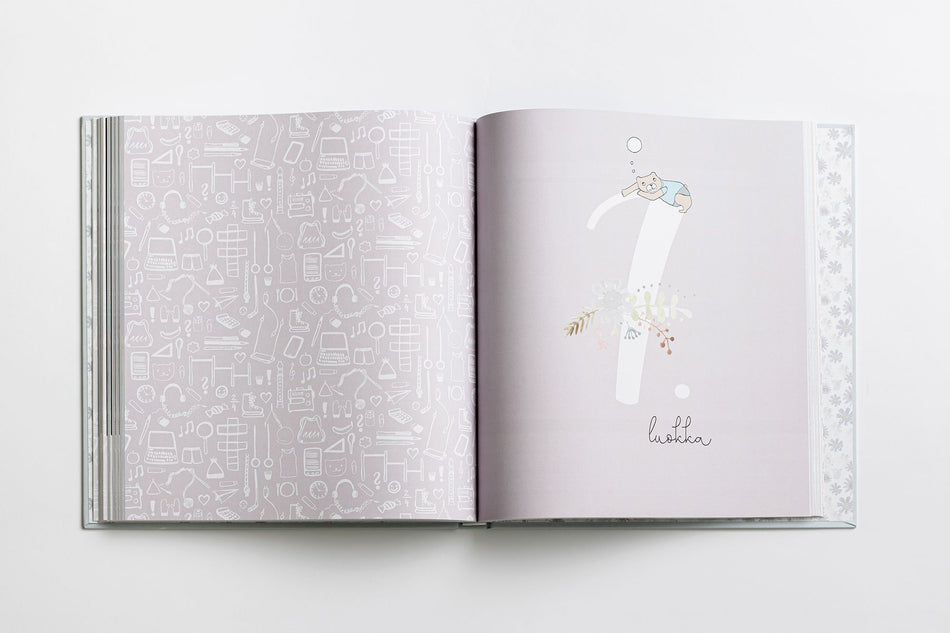 Kirja kasvaa lapsen mukana ja sen sivuille saat talteen ikimuistoisia hetkiä ja huomioita lapsen kasvusta pienestä ekaluokkalaisesta varhaisteiniksi.