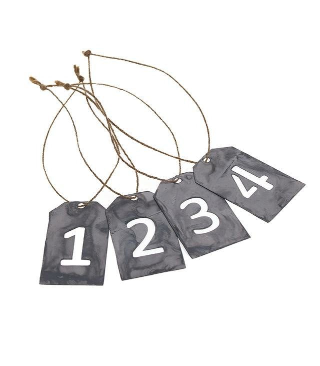 Harmaat metalliset numerokyltit juuttinarulla. Lajitelmassa numerot 1/2/3/4. Koko 3,5 x 6cm. Lue lisää