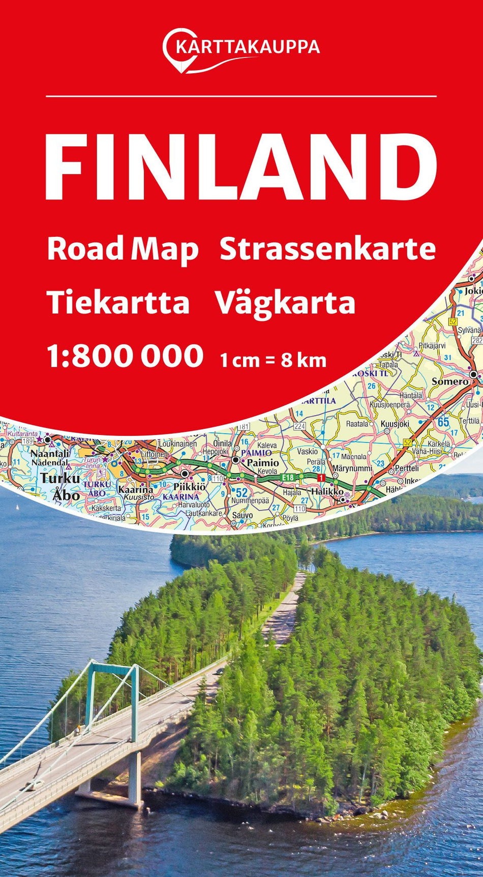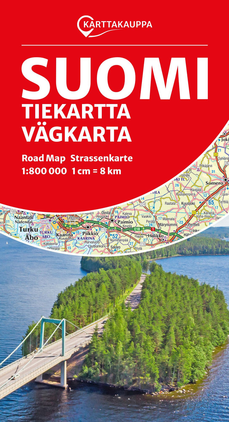 Suomi tiekartta kattaa koko Suomen ja sille on merkitty päätiestö tienumeroineen. Kartan mittakaava on 1:800 000 eli 1 cm kartalla vastaa 8 kilometriä.