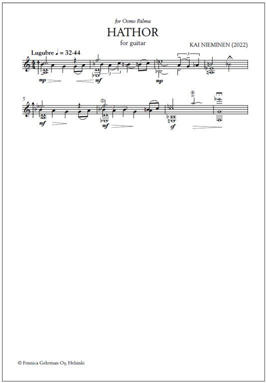 Downloadable and printable PDF edition. Kai Nieminen's enigmatic guitar miniature is like a sounding statue of Hathor, the ancient Egyptian goddess of joy, dance, music, and love. The slowly, dignified descending decorative motifs are accompanied by flute sound rays and alternating gentle and commanding sound columns. At the end of the composition, accompanied by the distant sound of footsteps, Hathor's figure disappears into the shadows of the sky with the confident gestures of a queen.