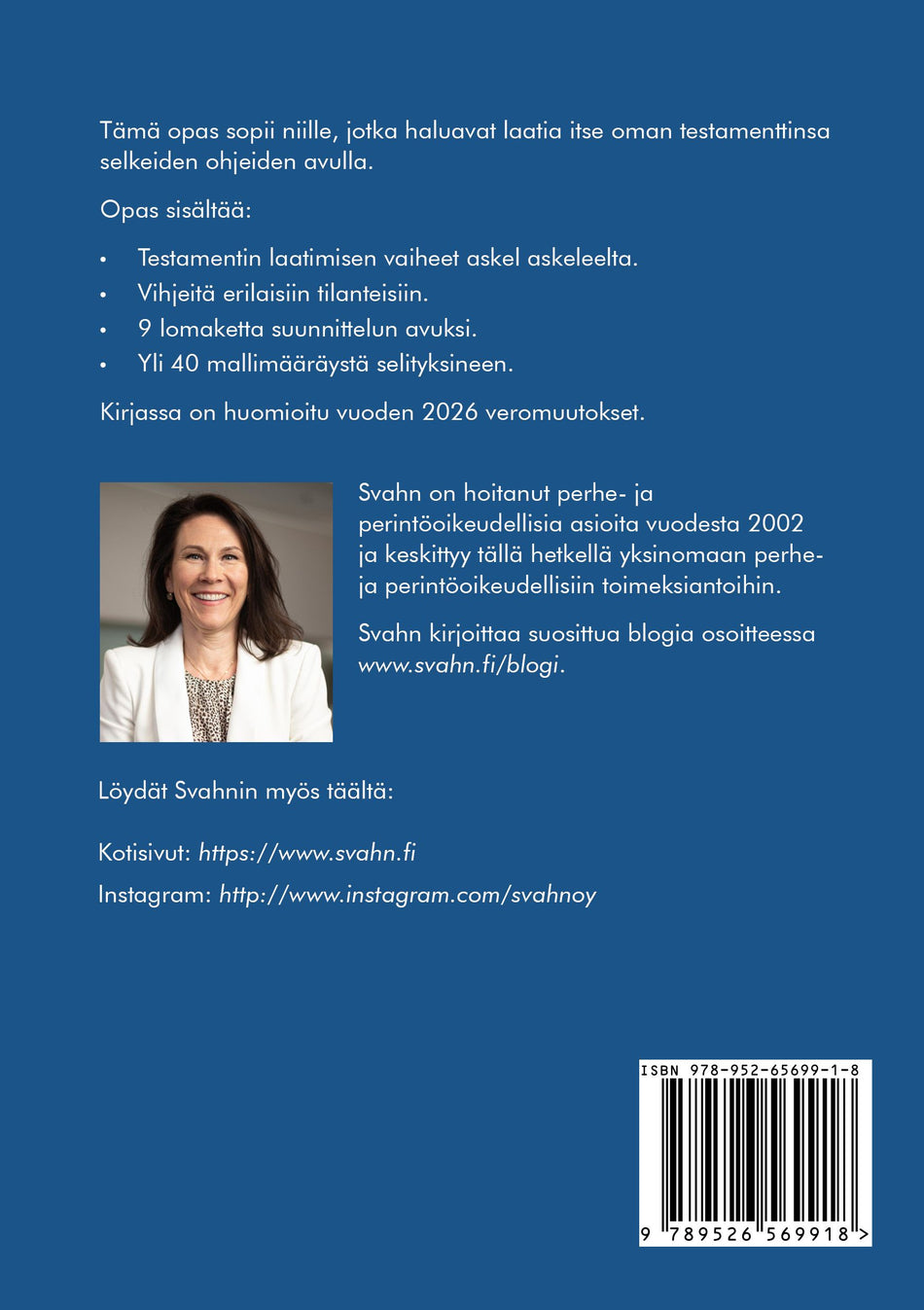 Opas sisältää: Testamentin laatimisen vaiheet askel askeleelta, Vihjeitä erilaisiin tilanteisiin, 9 lomaketta suunnittelun avuksi, Yli 40 mallimääräystä selityksineen.