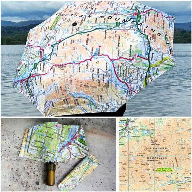 The OS Map Premium Umbrella - this licensed OS Map Premium Umbrella has a thick canopy, made from 100% UV protective material. The handle is made from top quality wood. It is produced in the UK and celebrates the Cairngorms National Park Lue lisää