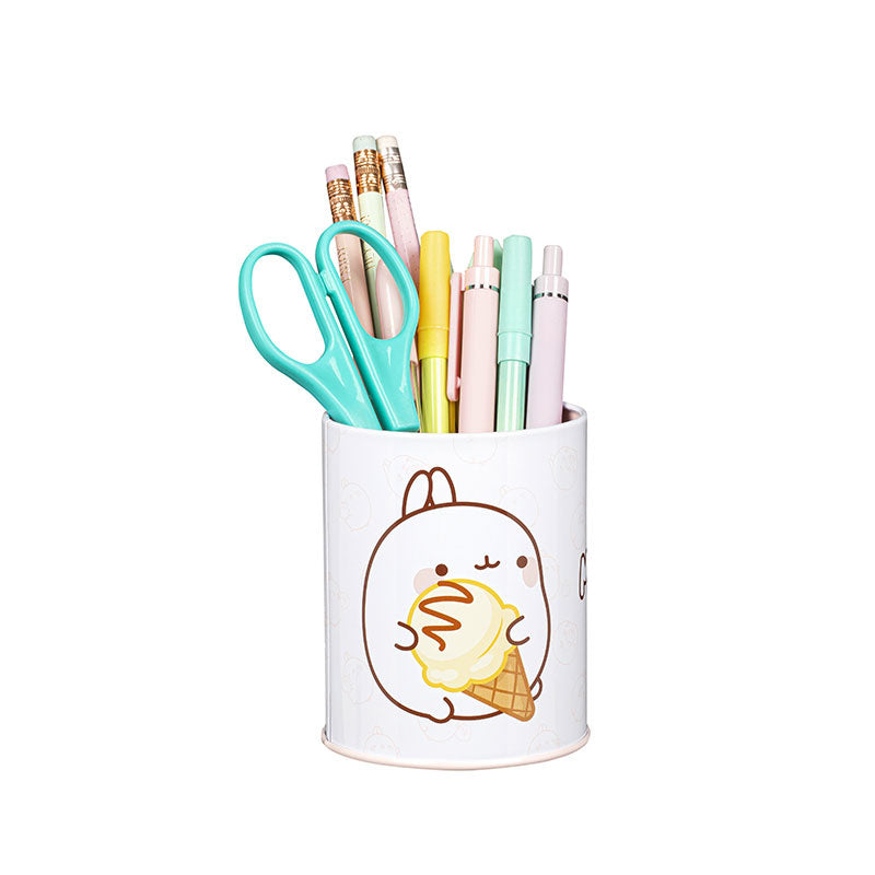 Iloinen ja suloinen Molang-kynäpurkki tuo piristystä työpöydällesi! Tämä pyöreä metallinen kynäpurkki on täydellinen säilytysratkaisu kynille, tusseille ja muille pienille koulutarvikkeille. Sen koko on 9,5 x 7,5 cm, joten se mahtuu kätevästi mihin tahansa työtilaan. Ulkopuolelle painettu Molang-... Lue lisää