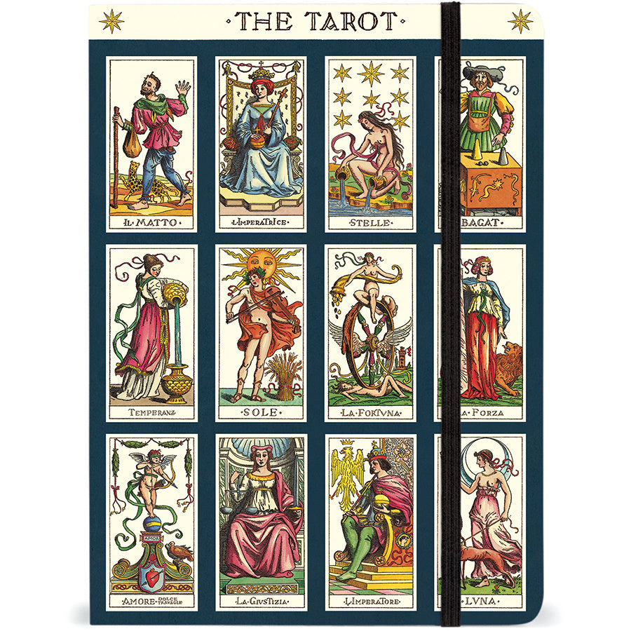 Muistikirja Tarot. 144 viivoitettua kermanvalkoista sivua. Tasku takakannessa. Kuminauhakiinnitys. Koko 15x20cm. Design: Cavallini. Lue lisää