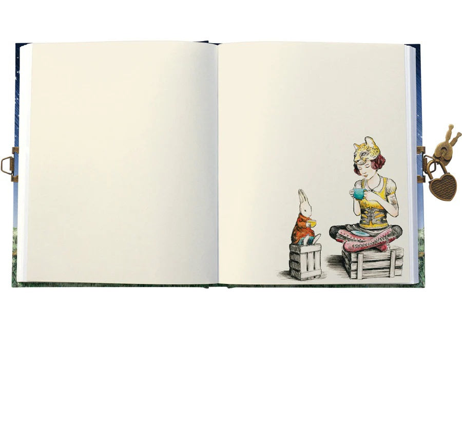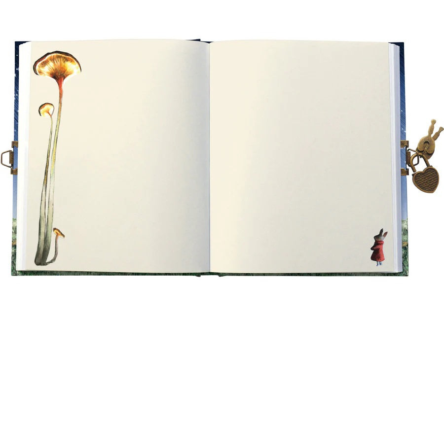 Lukollinen päiväkirja, kuvituksena jäniksen satuhetki. Mukana kaksi avainta. Koko 146×176 mm. 192 kuvioitua sivua. Design: Elise Hurst / Roger la Borde. Lue lisää