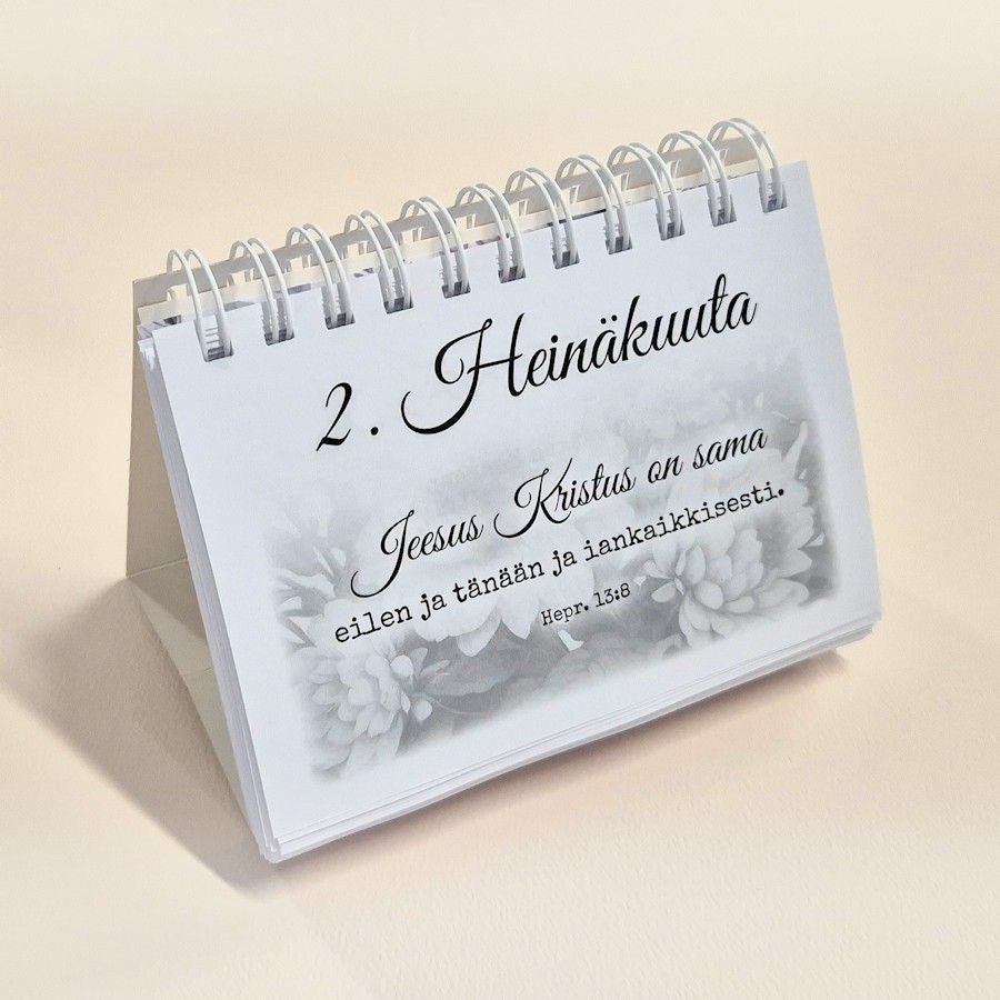 Aloita jokainen päiväsi Jumalan sanalla tämän kauniin pöytäkalenterin avulla. Jokainen sivu sisältää huolella valitun raamatunlauseen, joka tuo lohtua, rohkaisua ja toivoa arjen keskelle.