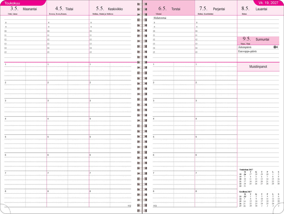 Kovakantinen kierresidottu Opettajan päivyri soveltuu opettajan kalenteriksi ja tuntisuunnitteluun. Kansi on läpinäkyvää muovia ja sen alla kansilehti. Viikkoaukeamalla on yksi viikko nimipäivineen. Aukeaman yläosassa on viikkokalenteri ja alaosassa on tuntien suunnitteluosio. Viikkosuunnittelusi... Lue lisää