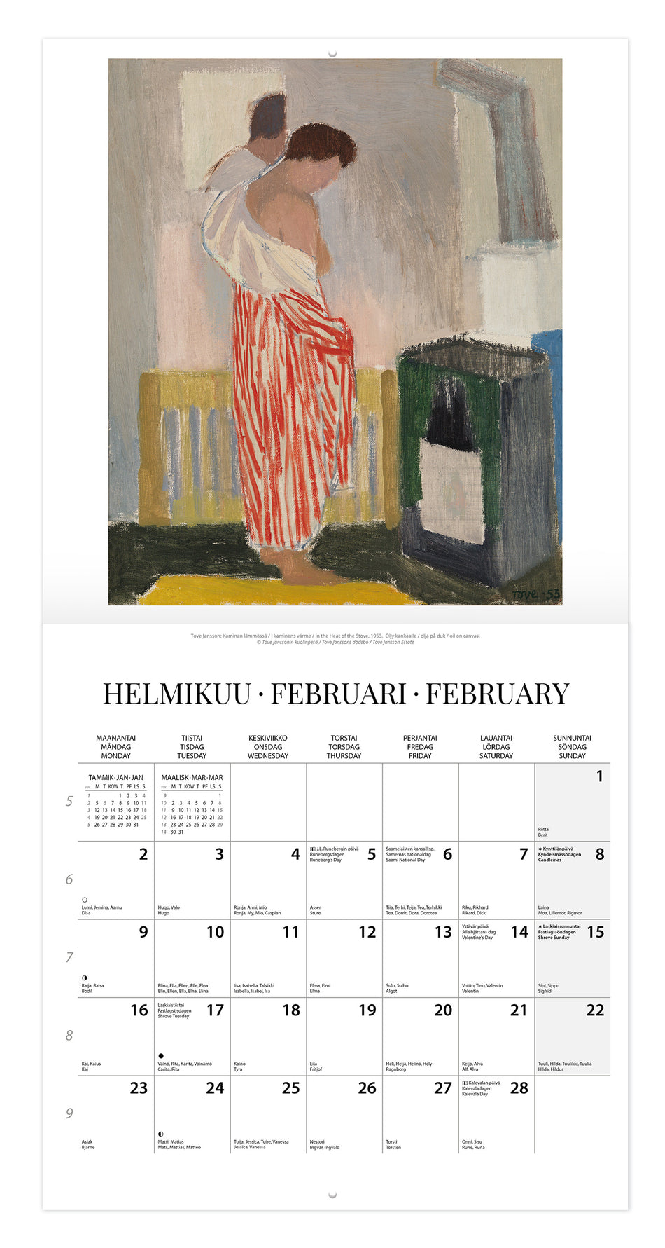 Tove Jansson 2026 seinäkalenteriin on koottu rakastetuimpia Toven taideteoksia. Kalenterin koko on 30x30cm ja se on kolmikielinen. Se sisältää suomalaiset ja suomenruotsalaiset liputuspäivät, sekä kuun vaiheet. Tämän voi ottaa jo käyttöön lokakuussa 2025! Lue lisää