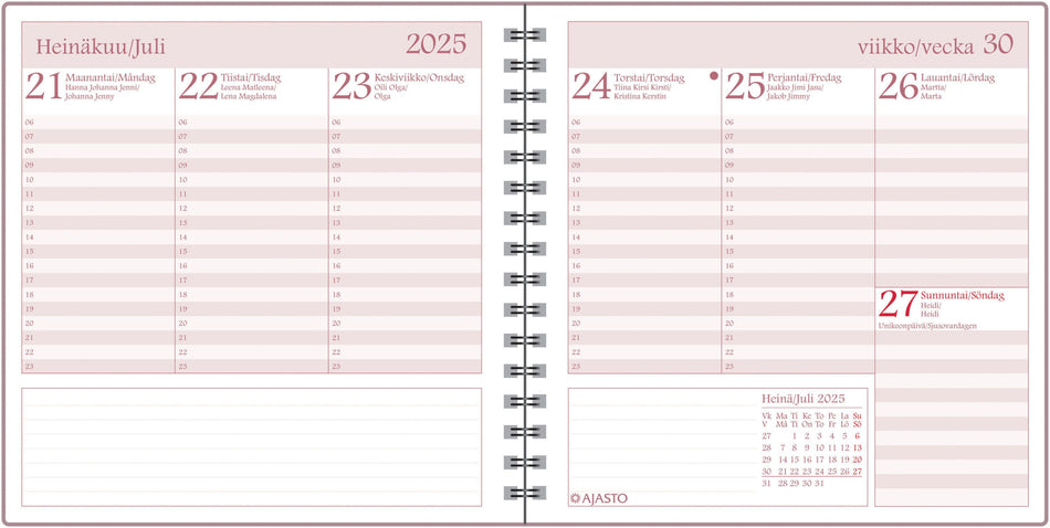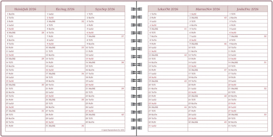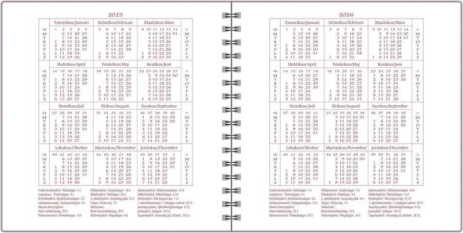 Koko 145 x 145 mm, parikierresidottu, kangaspäällysteiset leatherette-kannet, viikko aukeamalla, päiväkirja 29/2025-33/2026, vuosisuunnitelmat 7/2025-6/2027, suomalaiset ja suomenruotsalaiset nimipäivät, liputuspäivät Suomessa sekä kansalliset vapaapäivät 2025 ja 2026, runsaasti muistiinpanosivuj... Lue lisää
