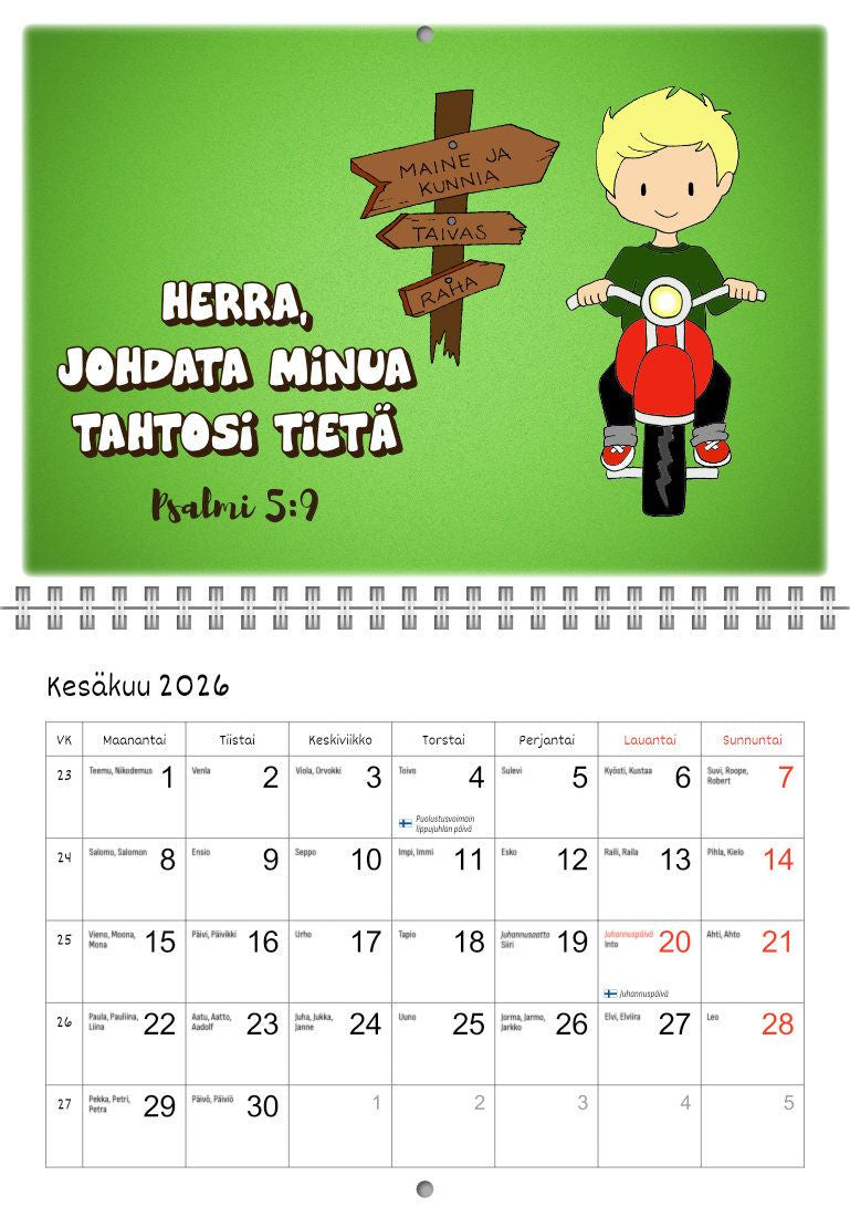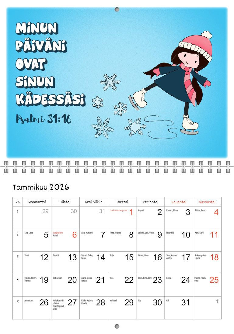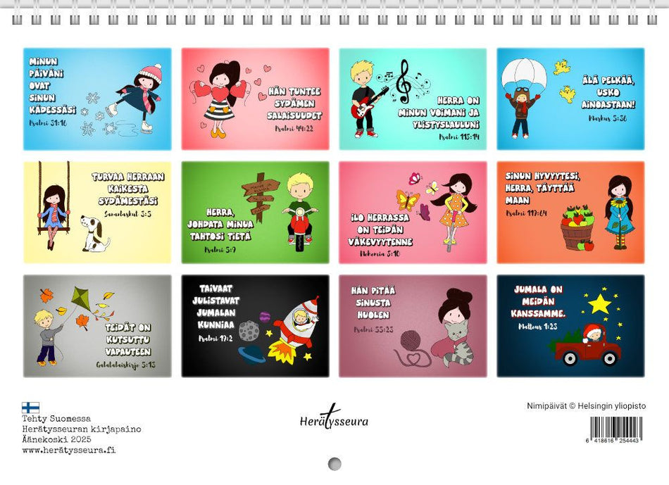Kauniisti kuvitetussa kalenterissa on joka kuukaudelle rohkaiseva ja uskoa vahvistava Raamatunlause. Kalenteri on kiva lahjaidea myös lapsille. Siitä on iloa ja siunausta koko vuodelle.