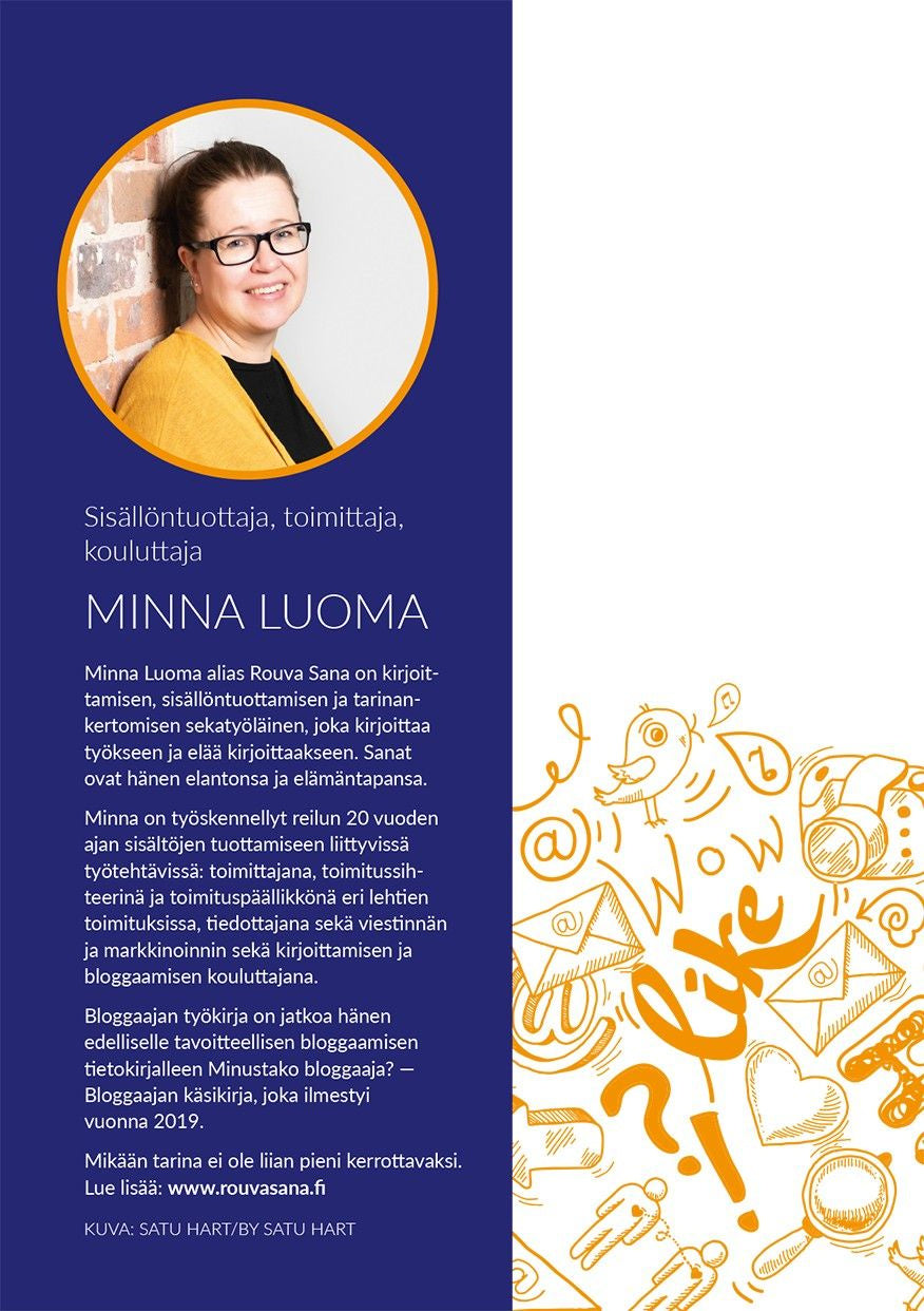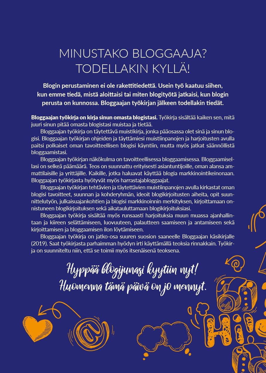Bloggaajan työkirja on jatko-osa Bloggaajan käsikirjalle (2019). Bloggaajan työkirjan on kirjoittanut ammattisisällöntuottaja, toimittaja, aikuisten sanataideohjaaja sekä ammatillinen opettaja Minna Luoma (Rouva Sana), jolla on pitkä kokemus paitsi kirjoittamisesta myös markkinointiviestinnästä.