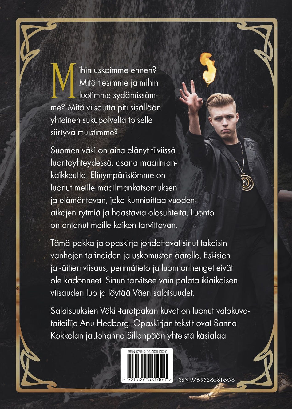 Salaisuuksien Väki on suomalainen tarotpakka, jossa yhdistyvät Kalevalan hahmot, suomalainen mytologia ja valokuvataide. Korttien kuvat on toteutettu suomalaisessa lähiluonnossa, jossa nykyajan ihmiset herättävät myyttien hahmot eloon.Pakka sisältää 78 korttia sekä 172-sivuisen opaskirjan. Opaski... Lue lisää