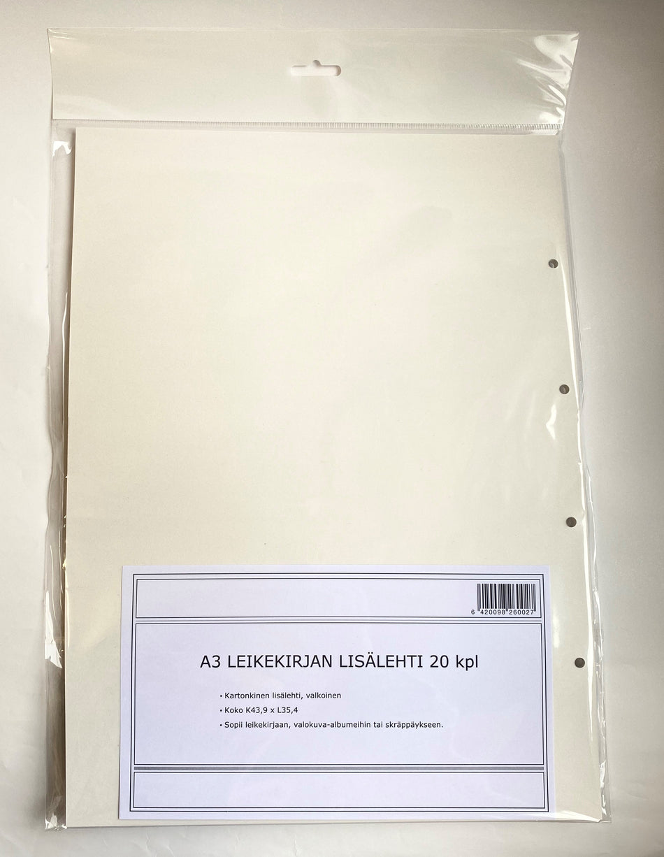 Valkoinen, A3-kokoinen kartonkinen lisälehti rei'ityksellä. Koko: korkeus 43,9 cm x leveys 35,4 cm. Sopii leikekirjaan, valokuva-albumeihin tai skräppäykseen. Pakkauksessa 20 kpl. Lue lisää