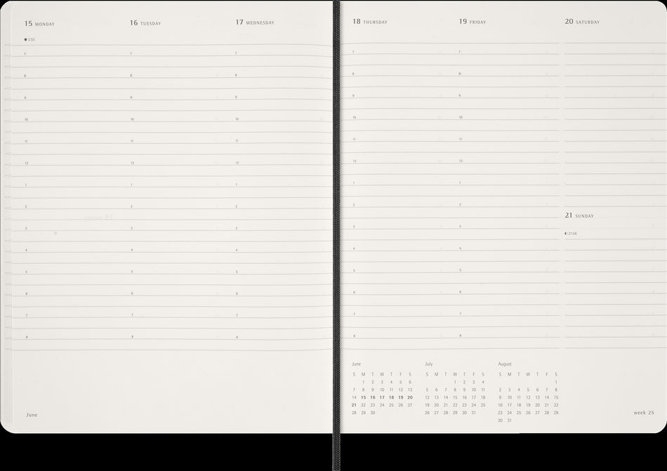 Moleskine XXL Essential Diary tekee organisoinnista ja suunnittelusta vaivatonta. Sisäsivuilla jokainen viikko on esitetty kahdelle sivulle. Viikonpäivät on järjestetty pystysuunnassa tuntikohtaisilla aikaväleillä tapaamisillesi klo 7.00–20.00, paitsi lauantai ja sunnuntai, jotka ovat aikatauluttamattomia. Jokaisella viikolla on myös pieni kolmen kuukauden kalenteri, joka auttaa suunnittelun hahmottamisessa. Tämä ajanvarauskirja on suunniteltu vastaamaan kaikkien, kuten opettajien, opiskelijoiden, ammattilaisten ja perheiden tarpeita. Se kattaa 15 kuukautta lokakuusta 2025 joulukuun 2026 loppuun. Mukana kirjamerkkinauha, runsaasti tarroja ja muistilappuja persoonallisiin merkintöihin.70 g/m² happovapaa paperi on valmistettu materiaalista, joka on peräisin hyvin hoidetuista, FSC®-sertifioiduista metsistä ja muista valvotuista lähteistä.