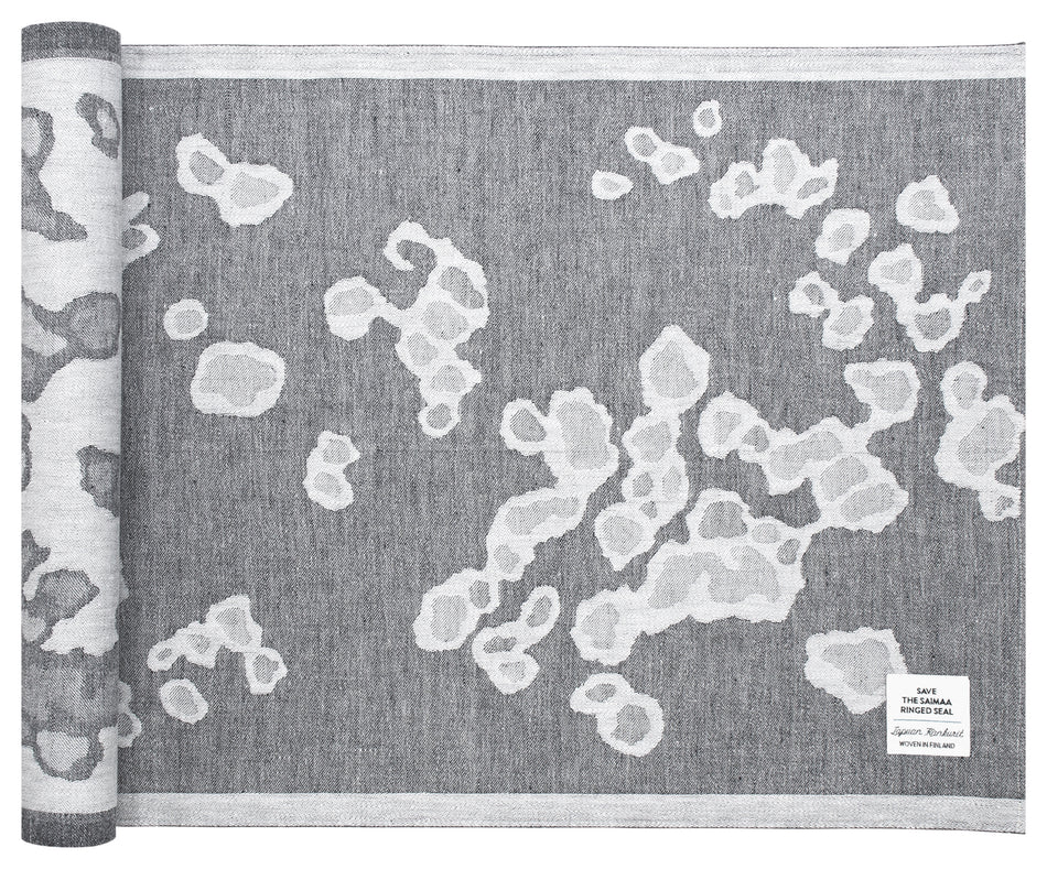 Tämä Saimaannorppa laudeliina toimii mainiosti myös kaitaliinana. Monikäyttöinen Lapuan Kankureiden kauniisti kudottu teos.