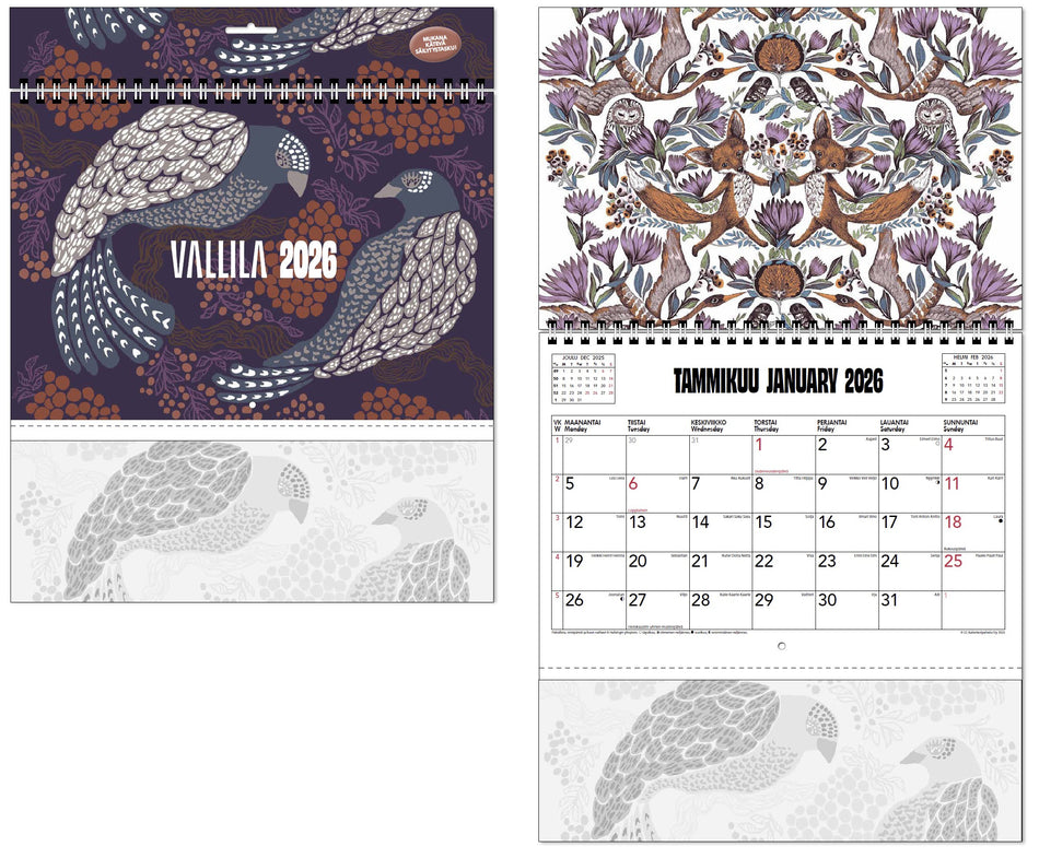 Kaunis Vallila-seinäkalenteri 2026 esittelee Vallilan väriloistoa modernien uutuuskuosien kautta. Viikonpäivät ja kuukaudet suomeksi ja englanniksi. Suomalaiset nimipäivät. Sisältää kätevän säilytystaskun ja ripustuspahvin. Koko avattuna 40x30 cm. Valmistettu FSC-sertifioidusta paperista. Lue lisää