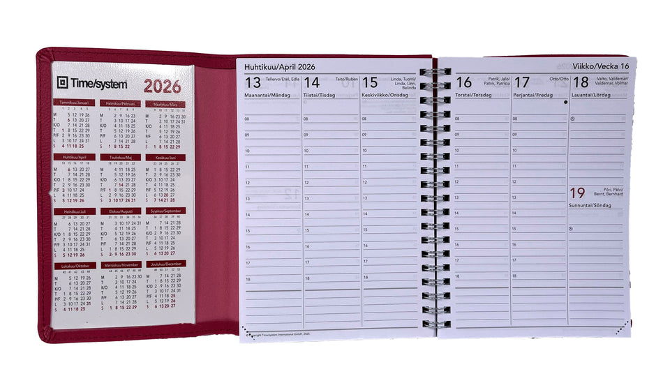 Kätevän kokoinen kaksikielinen Maxi-viikkokalenteri keinonahnakansilla, taittuvalla etukannella. Sivukoko 11,7 x 17 cm. Kielet: suomi ja ruotsi. Kalenteri on malliltaan viikko/aukeama. Keskeiset ominaisuudet: Viikkokalenteri 2026, vuosikalenteri 2026-2027, Nimipäivät, Kansalliset juhla- ja pyhäpäivät, syntymäpäivät, lomat, infosivuja, tehtävälistat, muistiinpanopaperia. Valmistettu FSC-sertifioidusta paperista.