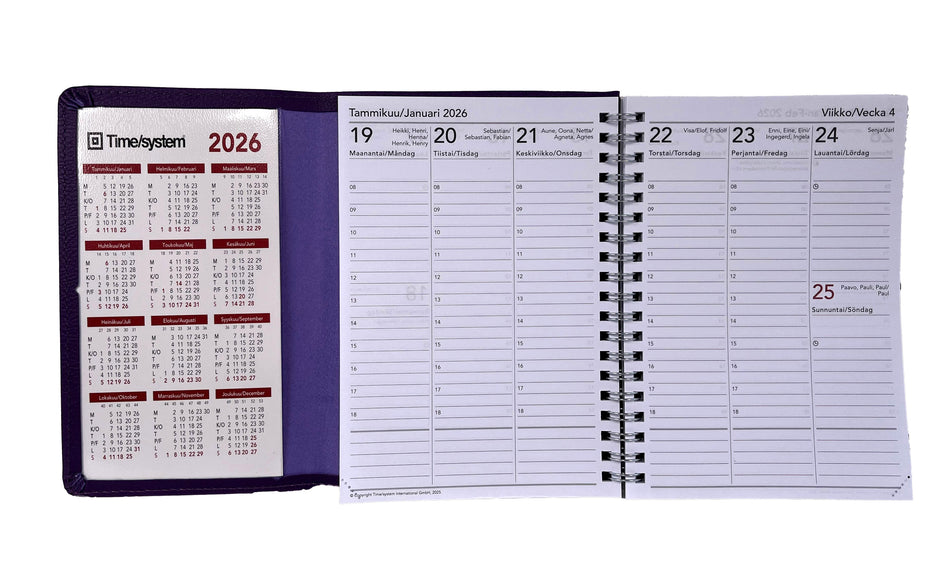 Kätevän kokoinen kaksikielinen Maxi-viikkokalenteri keinonahnakansilla, taittuvalla etukannella. Sivukoko 11,7 x 17 cm. Kielet: suomi ja ruotsi. Kalenteri on malliltaan viikko/aukeama. Keskeiset ominaisuudet: Viikkokalenteri 2026, vuosikalenteri 2026-2027, Nimipäivät, Kansalliset juhla- ja pyhäpäivät, syntymäpäivät, lomat, infosivuja, tehtävälistat, muistiinpanopaperia. Valmistettu FSC-sertifioidusta paperista.