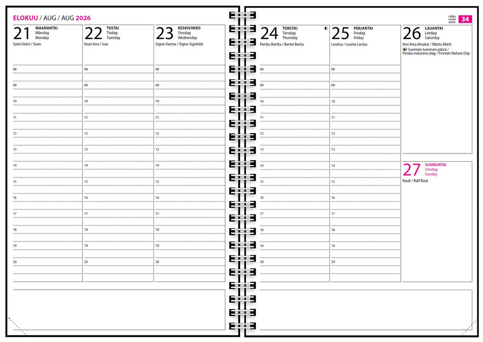 Kartonkikantinen A5 -kalenteri kauniilla Vallila designilla. Kolmikielinen(suomi,ruotsi,englanti) .Valmistettu FSC-sertifioidusta paperista. Lue lisää
