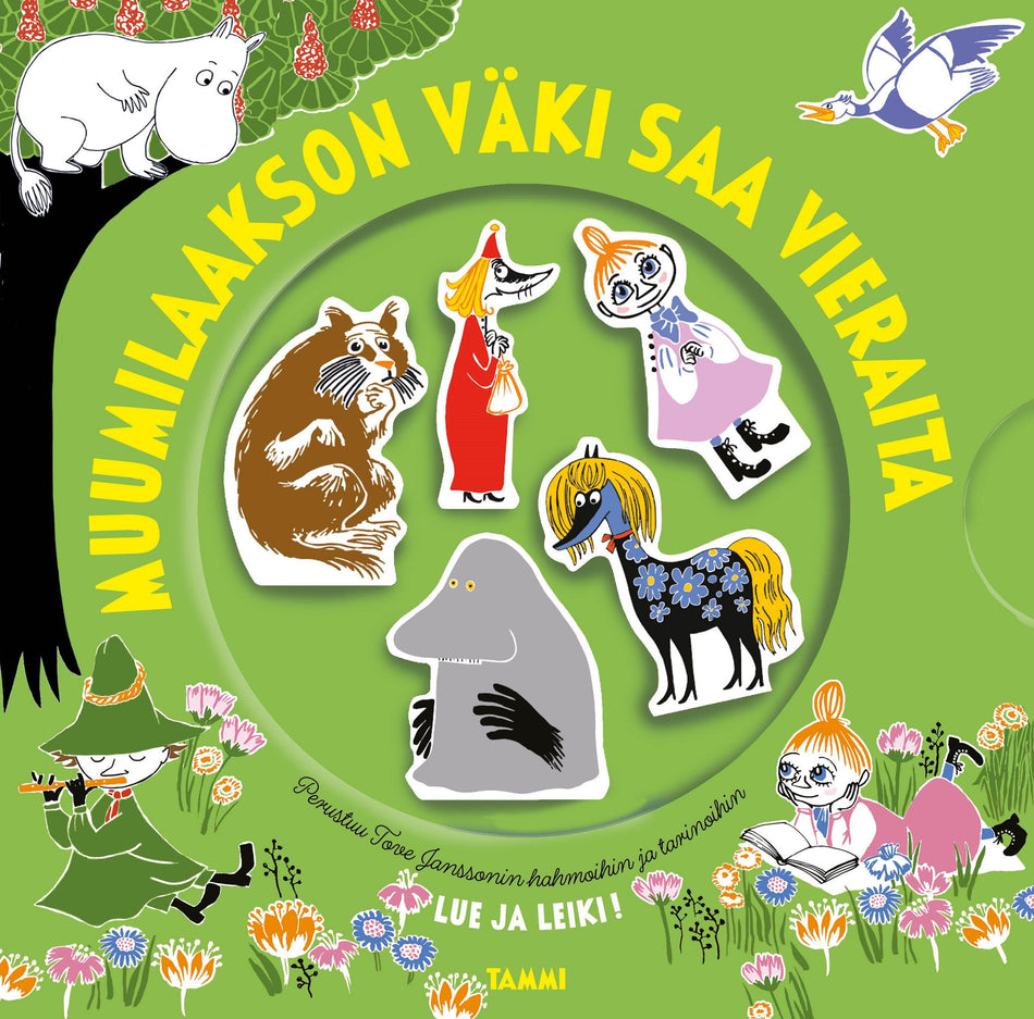 Muumilaaksoon saapuu vieraita, mutta missä on muumiperhe? Kirjan suloiset puuhahmot johdattavat pienokaisen lukemisen lomassa leikkeihin, jotka kehittävä silmän ja käden yhteistoimintaa, vuorovaikutustaitoja ja mielikuvitusta. Kirja hahmoineen täydentää sarjan, jossa voi kerätä omakseen kaikki suosituimmat Muumilaakson hahmot: sarjassa ovat aikaisemmin ilmestyneet Muumilaakson väki ja Muumilaakson väki rannalla.