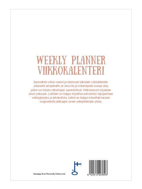 Jokaiselle arkipäivälle on oma tila ja viikonlopulle isompi alue, johon voi kirjata viikonlopun suunnitelmat. Lehtiöön on helppo kirjoittaa esimerkiksi lapsiperheen viikkojärjestys selkeyttämään arkea. Lajitelma 3 erilaista kuva-aihetta, verkkokaupan tilauksiin lähetetään 1kpl saatavilla olevaa väriä. Koko A4, 52 sivua, liimasidottu, lehtiö, taustassa vahva magneettikiinnitys jääkaapin oveen. -