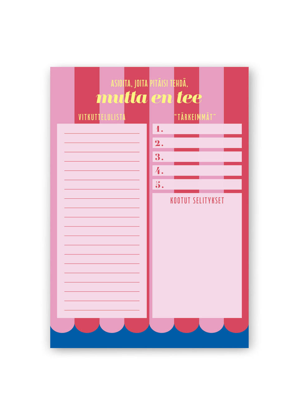 Putingin Pilke-sarjan muistilehtiö päivittäisiin merkintöihin ja aikataulutukseen. Lehtiössä on sinipuna-sävyinen väritys ja otsikot: "Asioita, joita pitäisi tehdä, mutta en tee / Vitkuttelulista / Tärkeimmät / Kootut selitykset". Putinki Design. Lue lisää