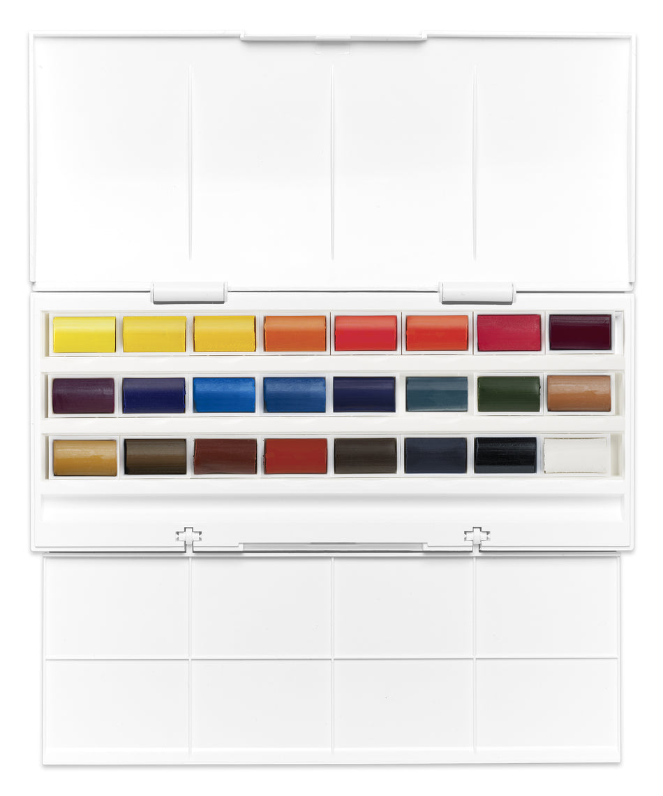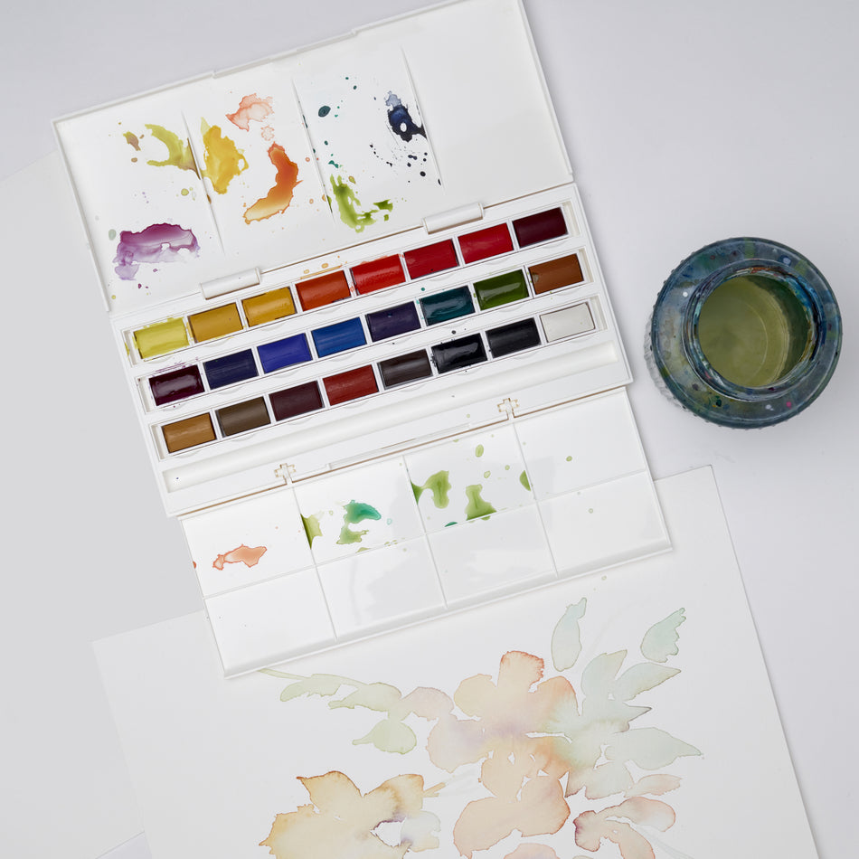 Tämä kyseinen W&N akvarellilajitelma on minulla ollut jo lähes vuosikymmenen käytössä ja palvellut kyllä rahansa edestä! Värinsekoituspaletti ja hyvin kuratoitu värivalikoima toimivat erinomaisesti sellaisenaan, mutta W&N ehdoton etu ovat sen irralliset värinapit, joiden ansiosta sinun on mahdollista uusia värejä sitä mukaan kun ne kuluvat. Eli tämä paletti kestää käytössäsi vaikka loppuelämän!