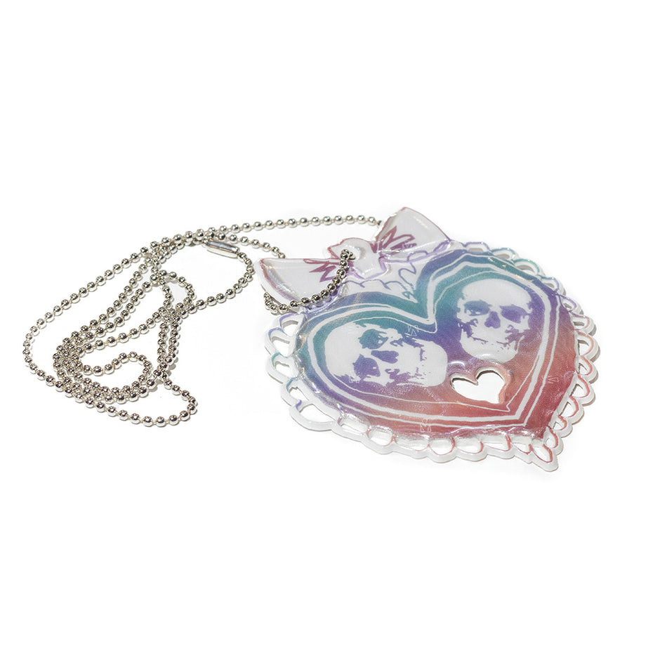 Pitsireunainen Love or Die -sydänheijastin hohtaa lämpimän oranssin, violetin ja vihreän sävyissä.