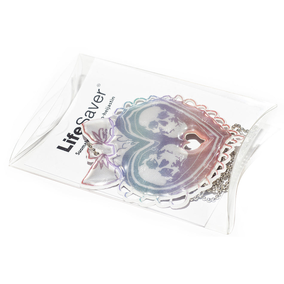 Heijastimessa on noin 70 cm pituinen metallinen palloketju. Pakkauksessa on myös erillinen metallinen papukaijalukko vaihtoehtoista kiinnitystä varten. Valmistettu käsityönä Suomessa. Heijastimet mitat: leveys 8,5 cm x korkeus 9,5 cm