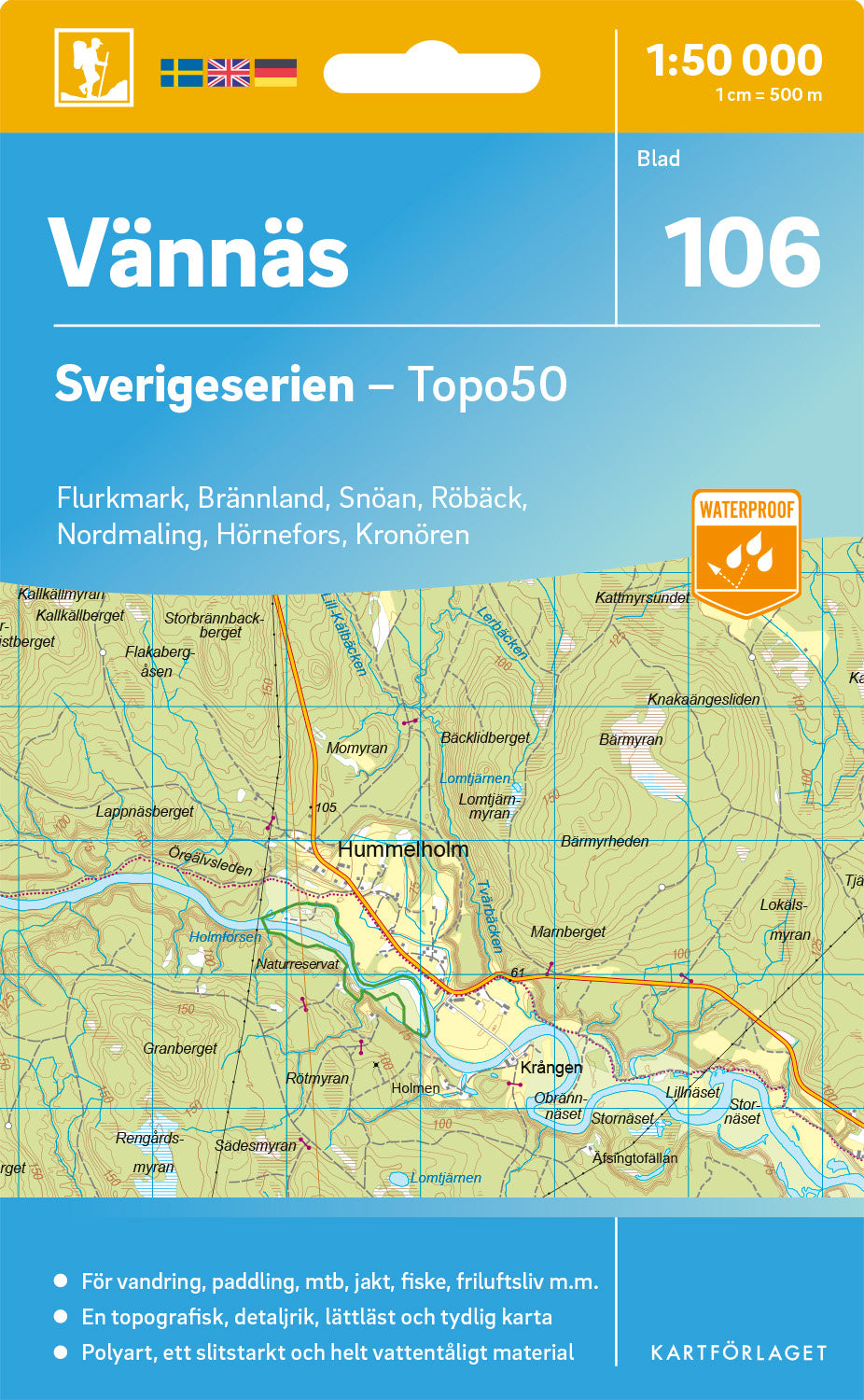 Sverigeserien är en kvalitetskarta som är gjord för att användas! Aktuellt kartdata är hämtat från Lantmäteriet och den är tryckt på Polyart som är helt vattentåligt och slitstarkt. Det mjuka materialet tål att vikas om och om igen. Den klarar både vinterns och sommarens ibland utmanande väder i Sverige. Kartorna har en utförlig teckenförklaring på svenska, engelska och tyska.