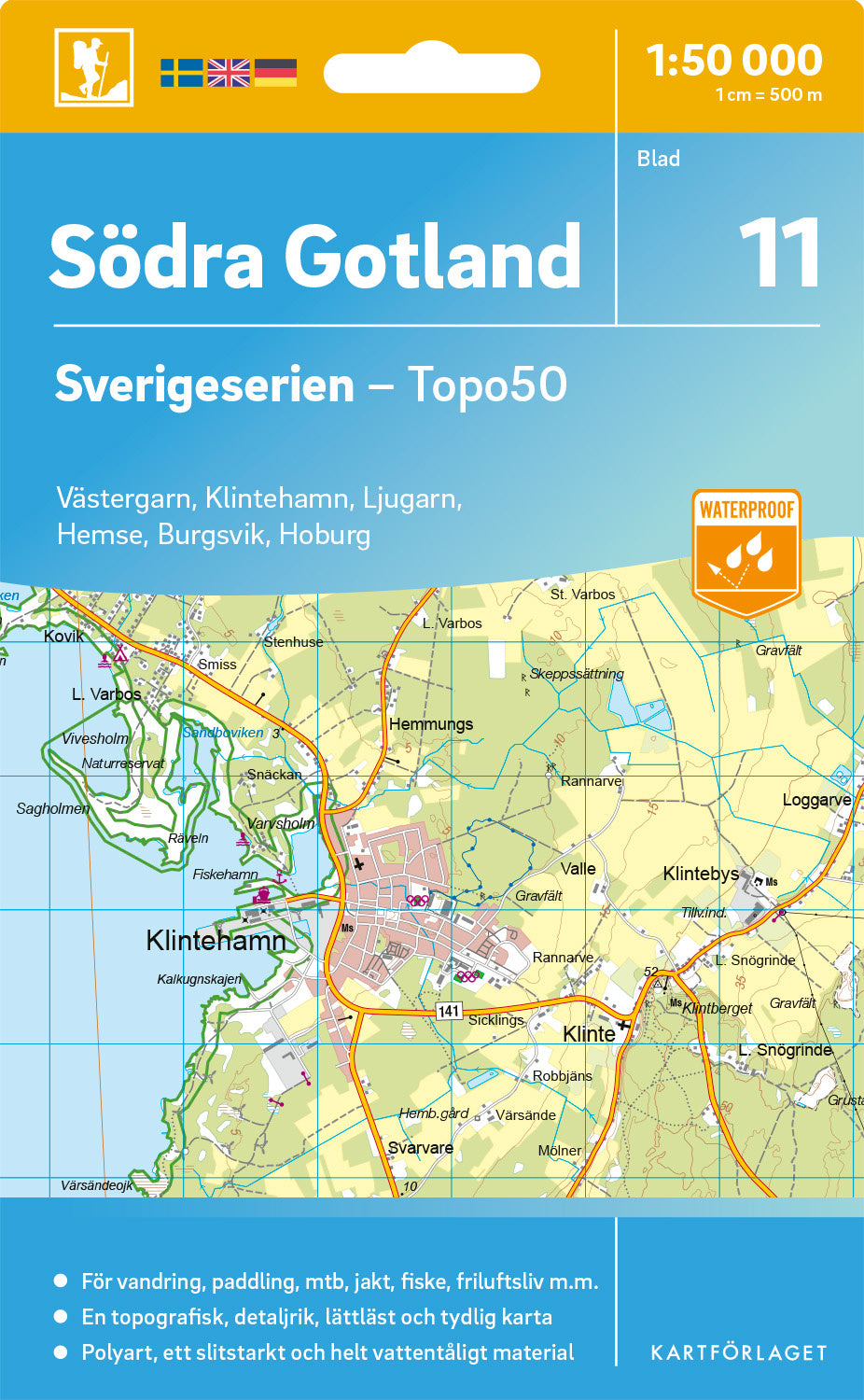 Sverigeserien är en kvalitetskarta som är gjord för att användas! Aktuellt kartdata är hämtat från Lantmäteriet och den är tryckt på Polyart som är helt vattentåligt och slitstarkt. Det mjuka materialet tål att vikas om och om igen. Den klarar både vinterns och sommarens ibland utmanande väder i Sverige. Kartorna har en utförlig teckenförklaring på svenska, engelska och tyska.