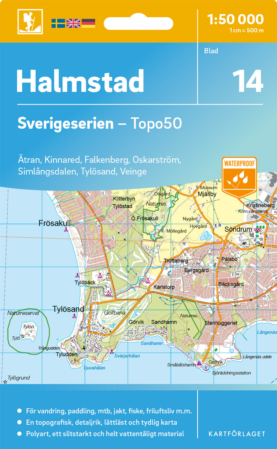 Sverigeserien är en kvalitetskarta som är gjord för att användas! Aktuellt kartdata är hämtat från Lantmäteriet och den är tryckt på Polyart som är helt vattentåligt och slitstarkt. Det mjuka materialet tål att vikas om och om igen. Den klarar både vinterns och sommarens ibland utmanande väder i Sverige. Kartorna har en utförlig teckenförklaring på svenska, engelska och tyska.
