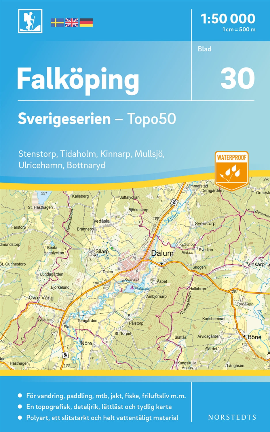 Sverigeserien är en kvalitetskarta som är gjord för att användas! Aktuellt kartdata är hämtat från Lantmäteriet och den är tryckt på Polyart som är helt vattentåligt och slitstarkt. Det mjuka materialet tål att vikas om och om igen. Den klarar både vinterns och sommarens ibland utmanande väder i Sverige. Kartorna har en utförlig teckenförklaring på svenska, engelska och tyska.
