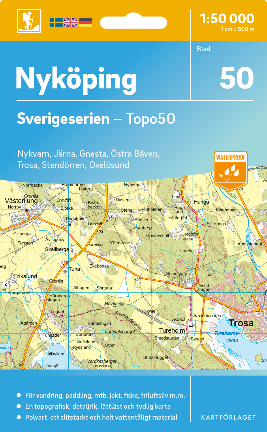 Sverigeserien är en kvalitetskarta som är gjord för att användas! Aktuellt kartdata är hämtat från Lantmäteriet och den är tryckt på Polyart som är helt vattentåligt och slitstarkt. Det mjuka materialet tål att vikas om och om igen. Den klarar både vinterns och sommarens ibland utmanande väder i Sverige. Kartorna har en utförlig teckenförklaring på svenska, engelska och tyska.