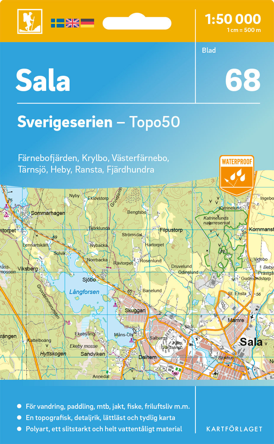 Sverigeserien är en kvalitetskarta som är gjord för att användas! Aktuellt kartdata är hämtat från Lantmäteriet och den är tryckt på Polyart som är helt vattentåligt och slitstarkt. Det mjuka materialet tål att vikas om och om igen. Den klarar både vinterns och sommarens ibland utmanande väder i Sverige. Kartorna har en utförlig teckenförklaring på svenska, engelska och tyska.