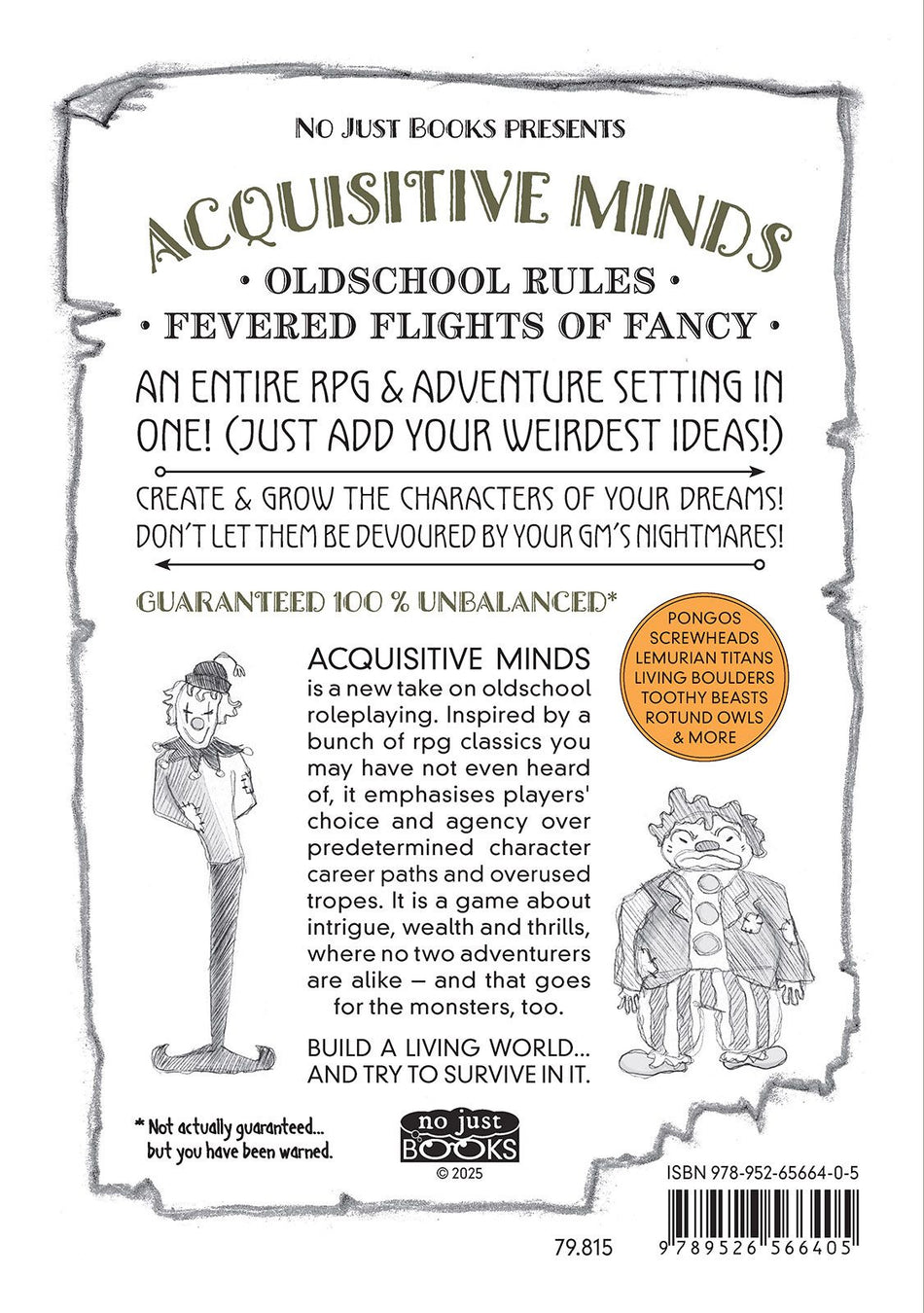 Acquisitive Minds on uusi, genren perinteisiin nojaava mutta niitä oivaltavasti uudistava fantasiaroolipeli. Sen joustavat ja luovuuteen kannustavat säännöt tarjoavat pelaajille ja pelinjohtajalle kehyksen, joka tukee yhteisöllistä tarinankerrontaa ja maailmanrakennusta. Runsaat esimerkit ja insp... Lue lisää